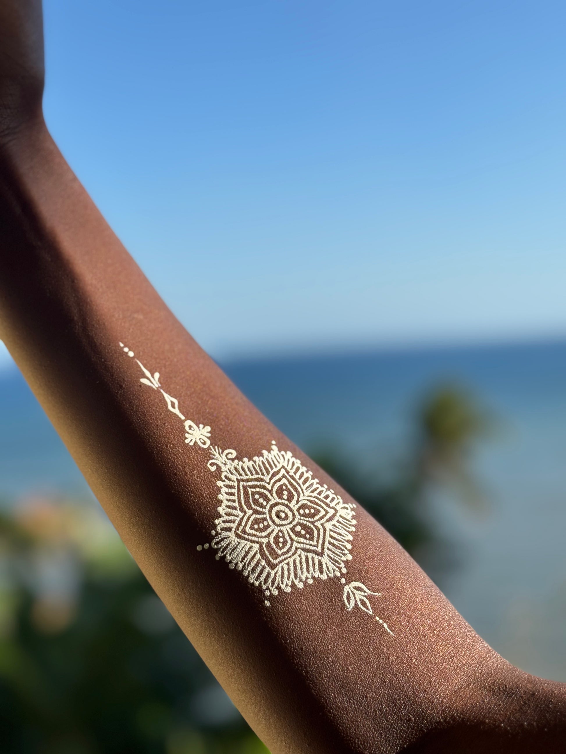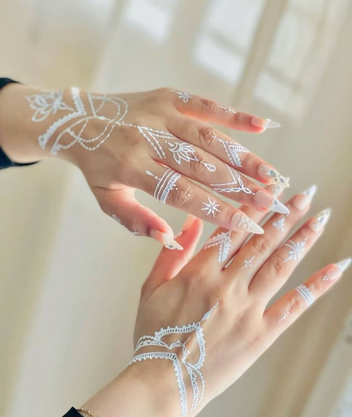 Plongez dans un monde de grâce et de sophistication avec notre prestation exclusive de henné blanc. Laissez la pureté immaculée du henné blanc éclairer votre peau, créant des motifs délicats et raffinés qui racontent votre histoire unique.